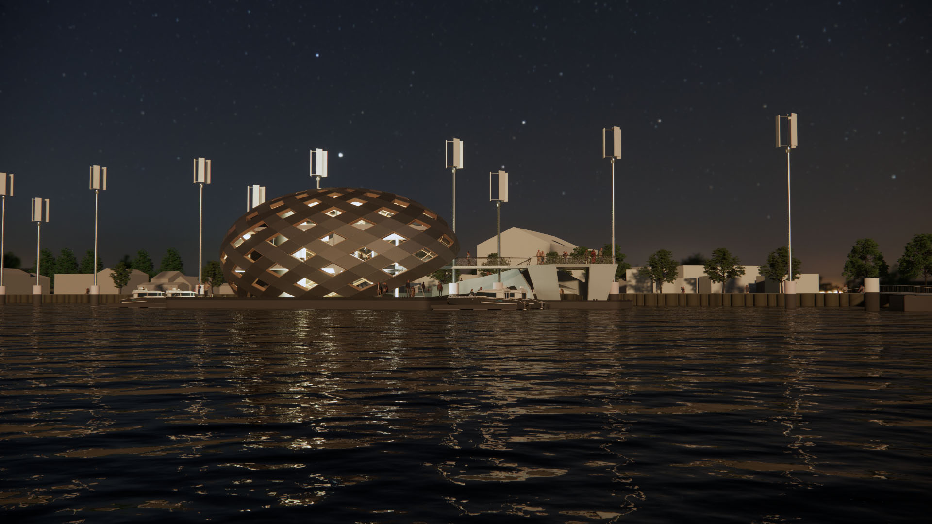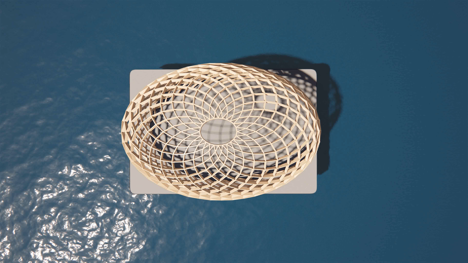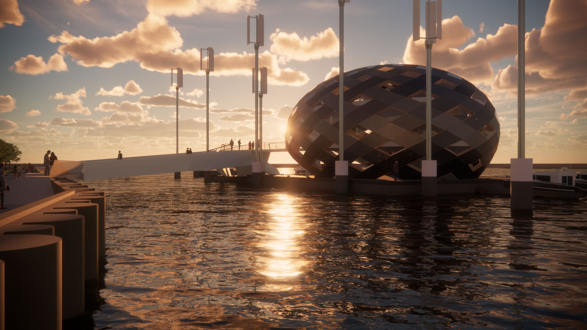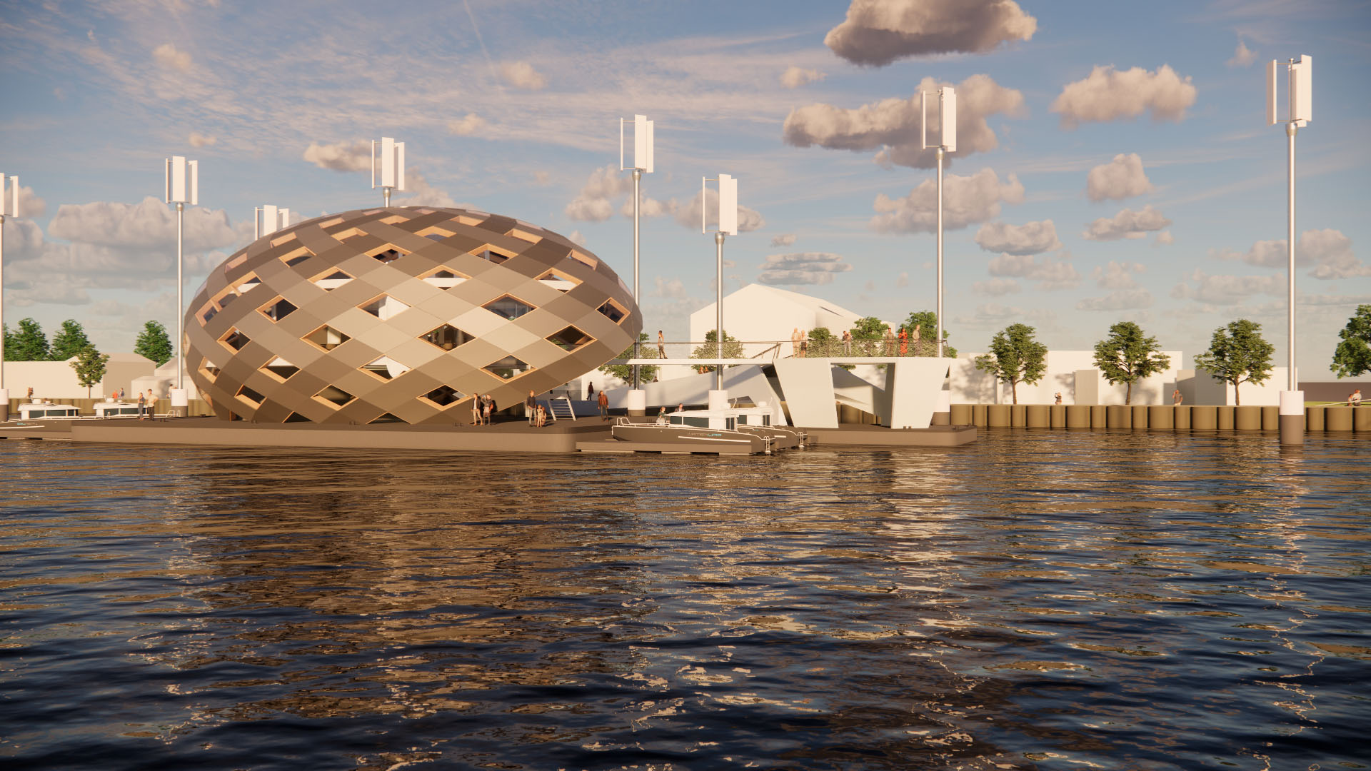 A biophilic circular exoskeleton that houses charging infrastructure for electric vessels, powered by renewable current and wind energy.