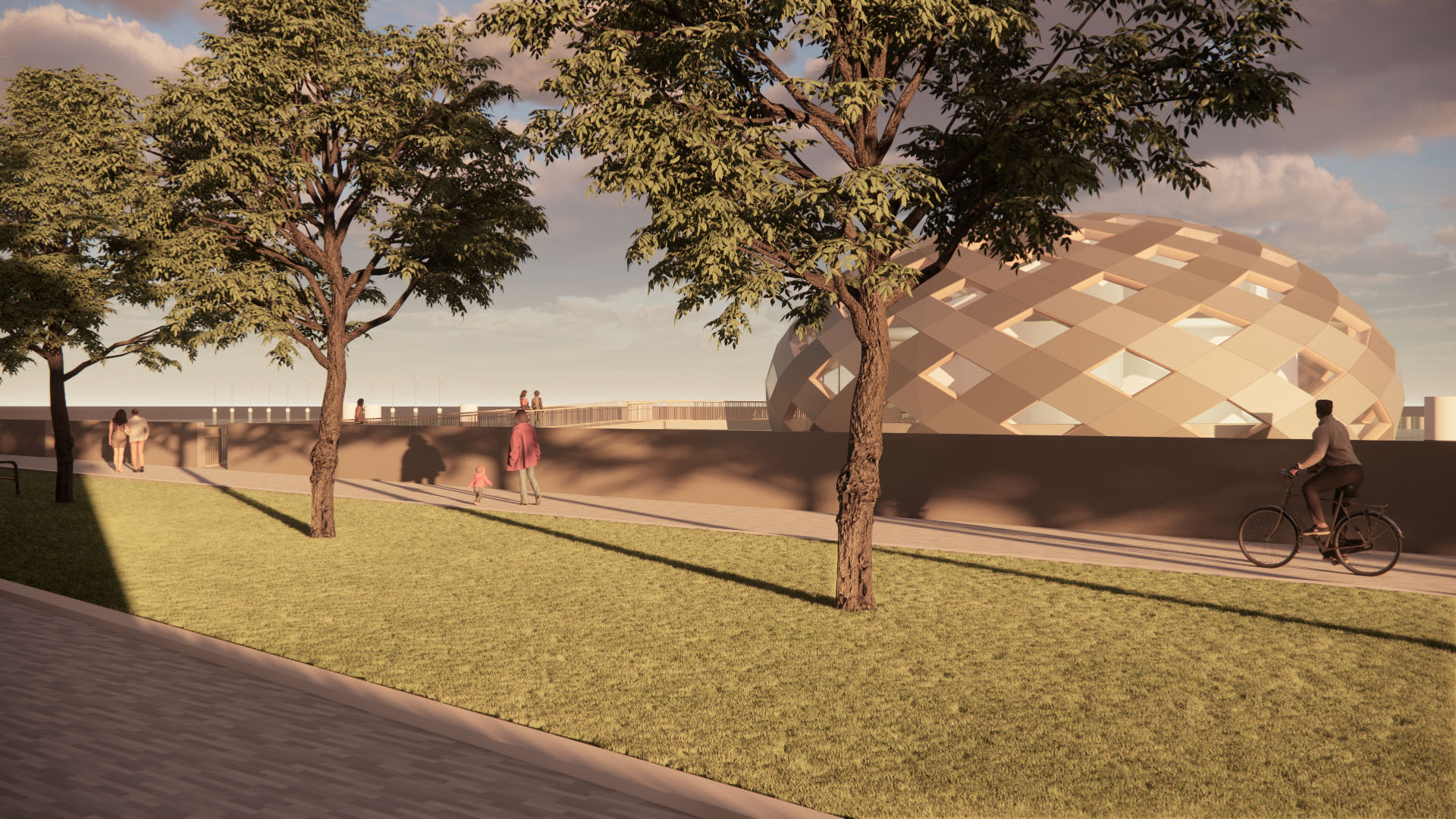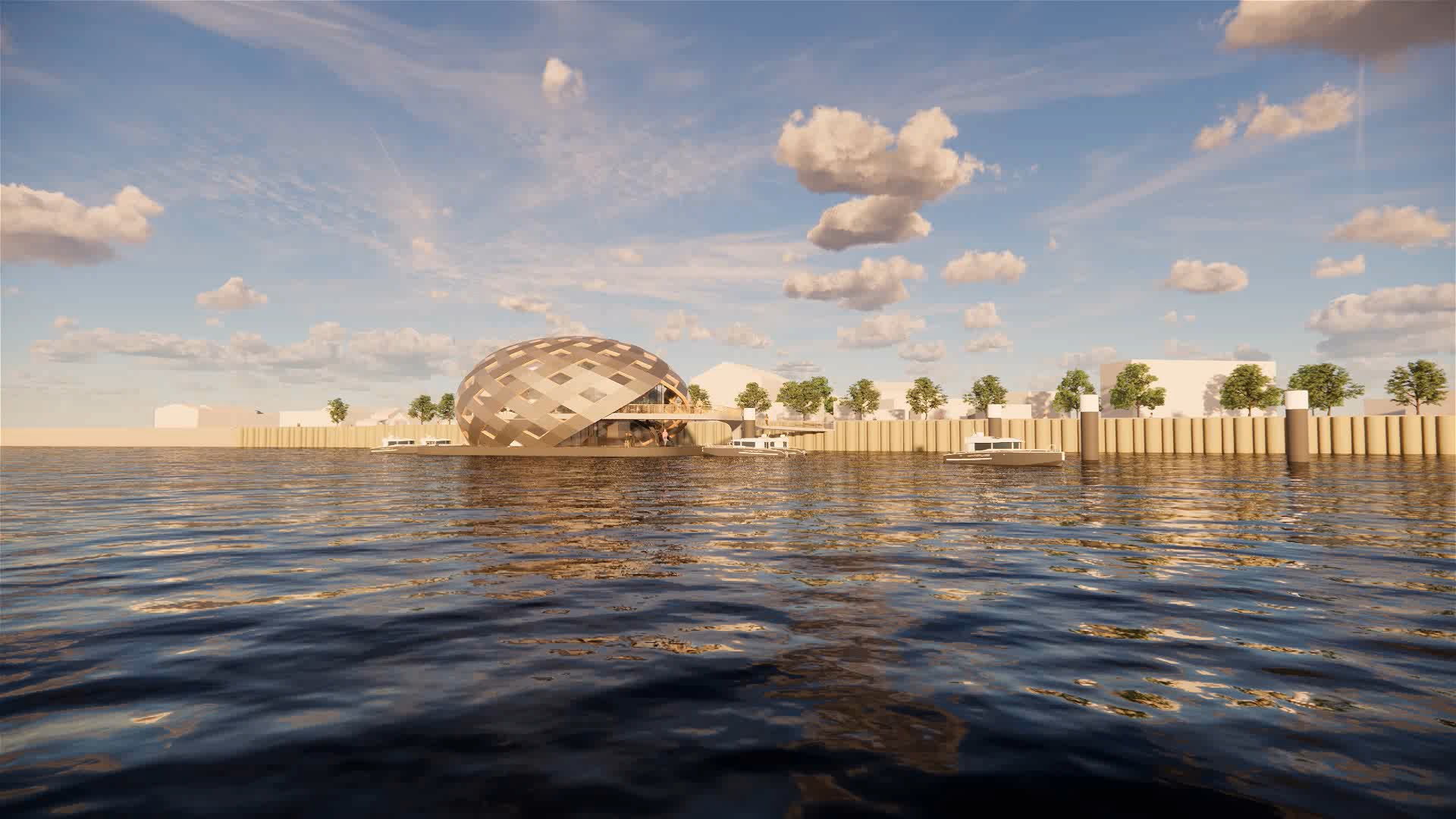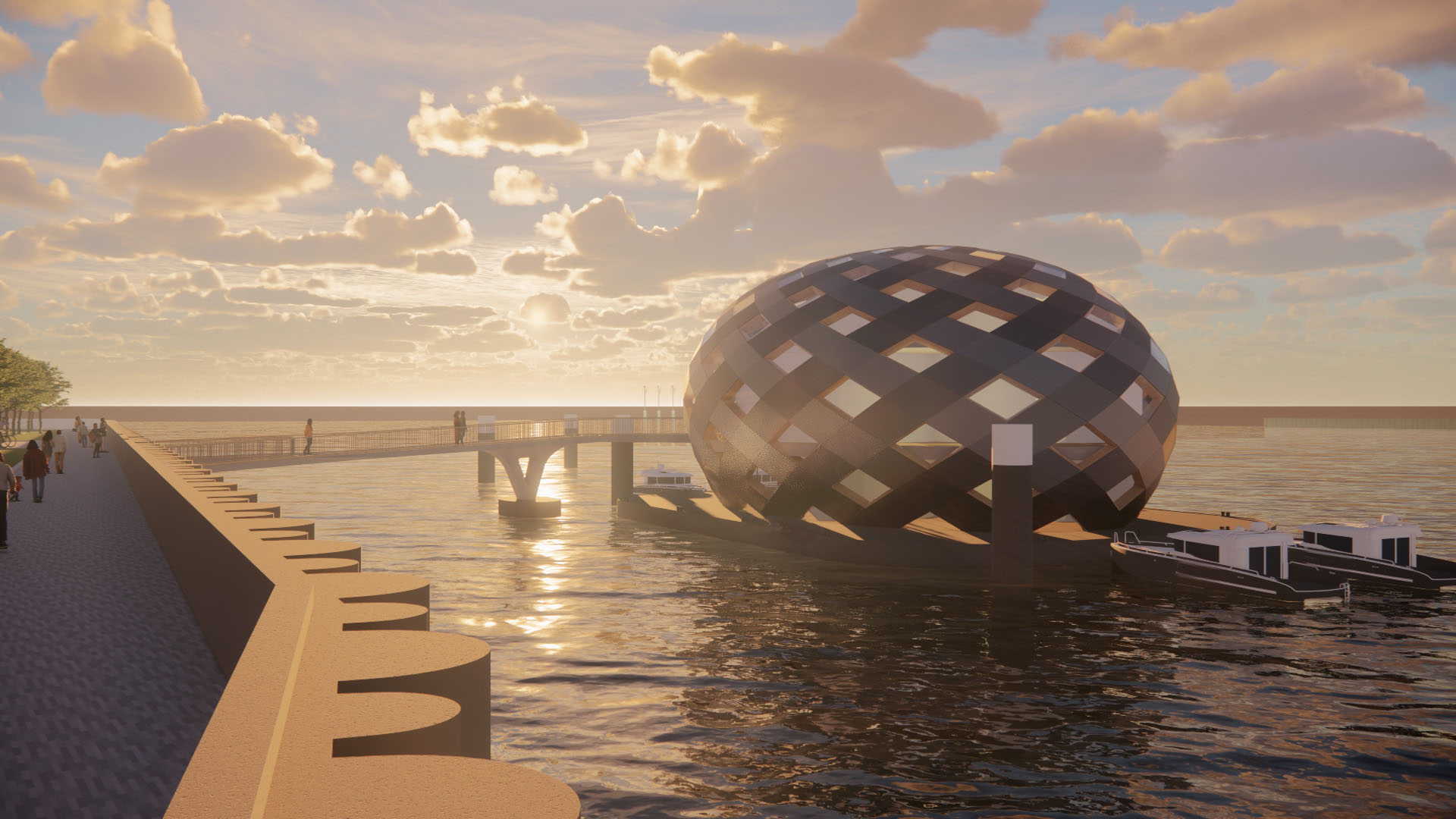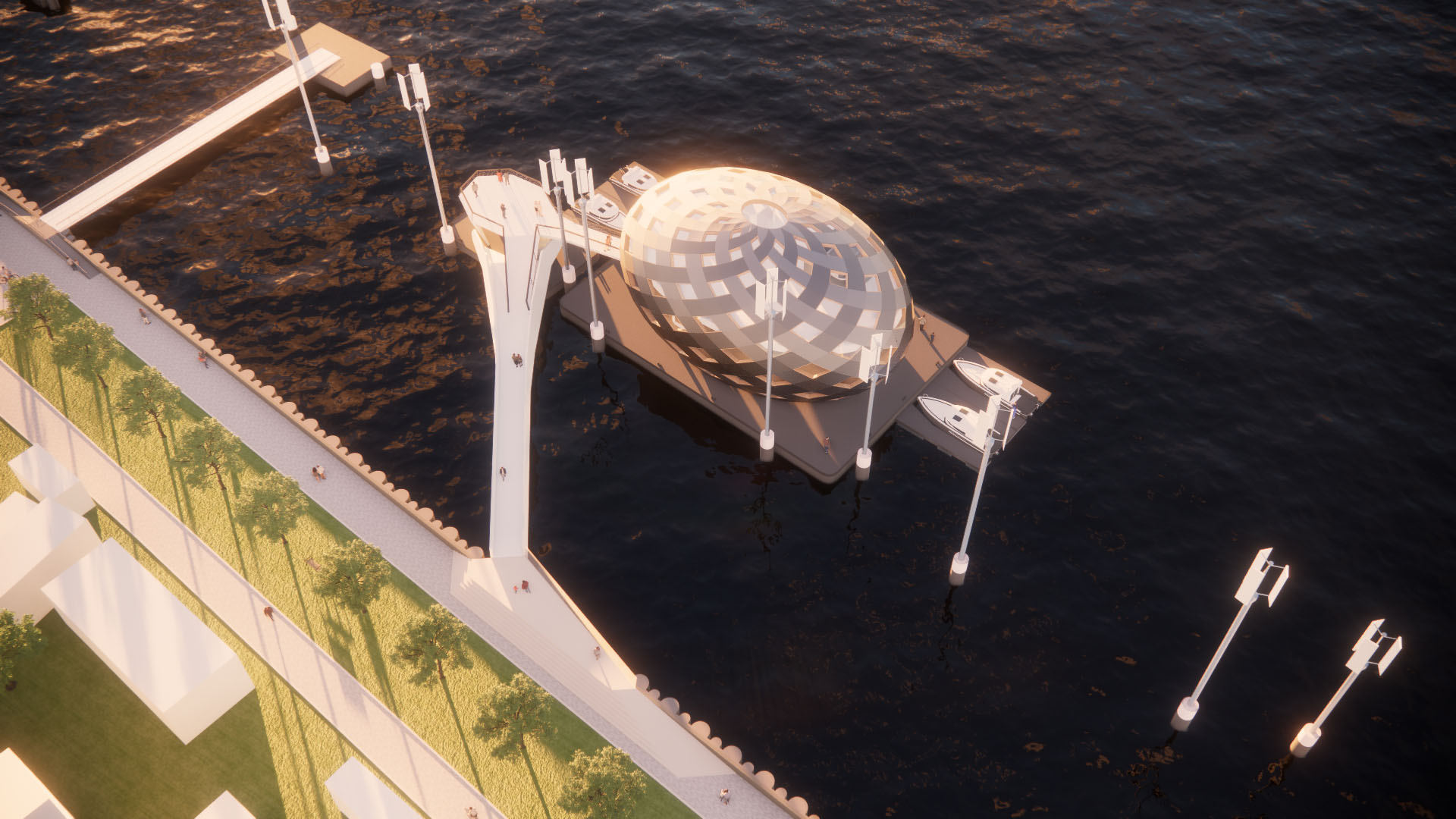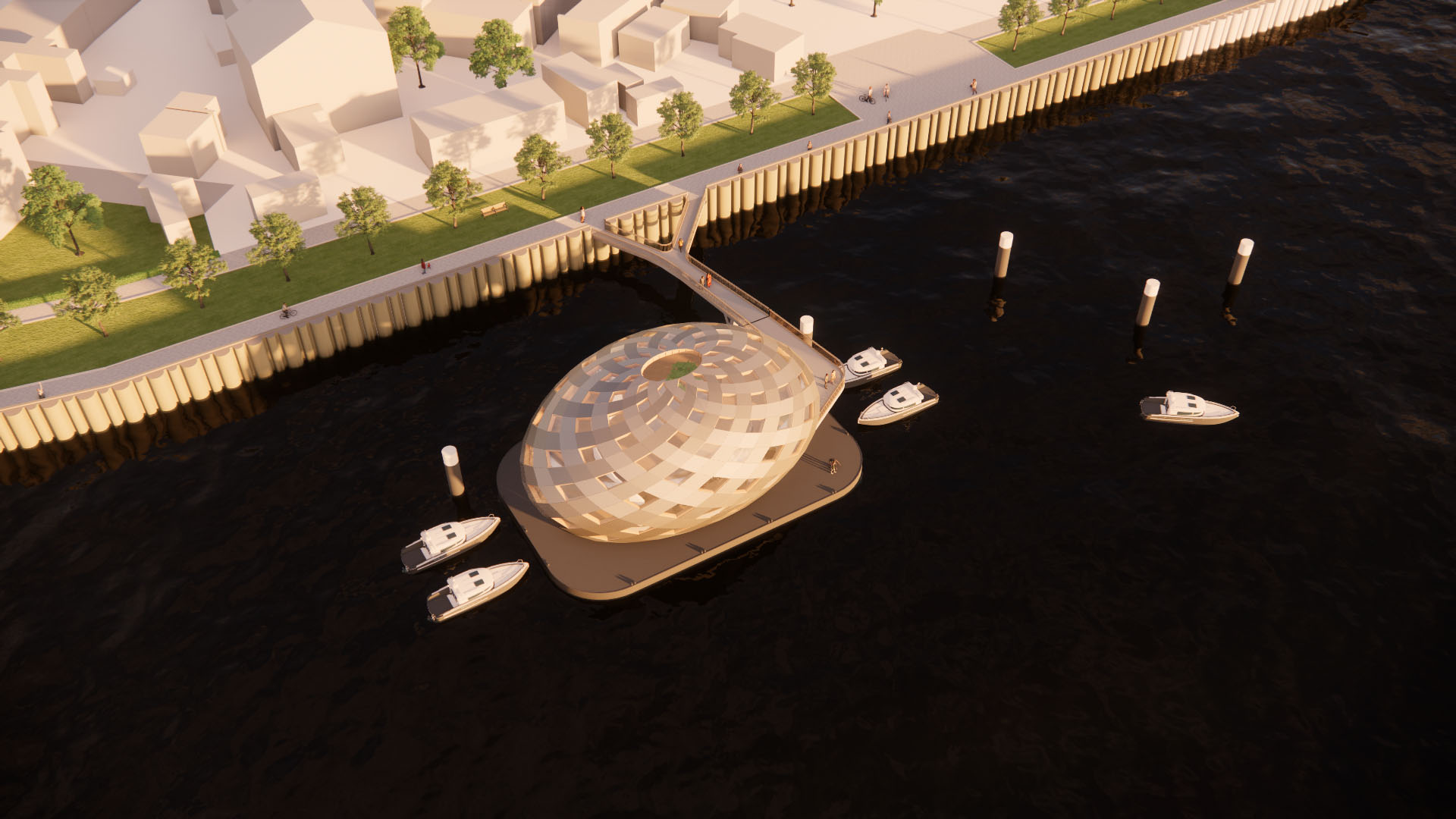 A biophilic circular exoskeleton that houses charging infrastructure for electric vessels, powered by renewable current and wind energy.