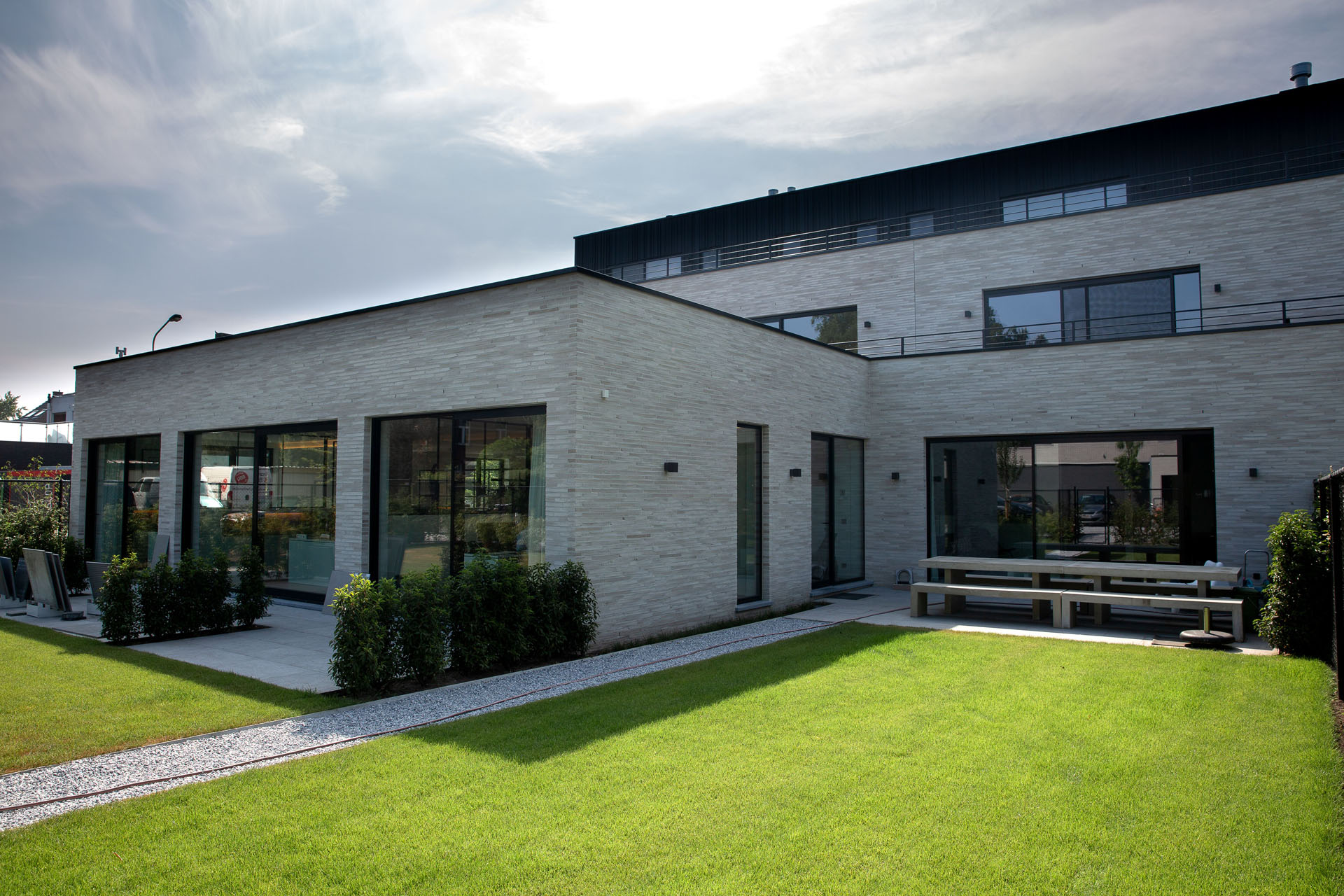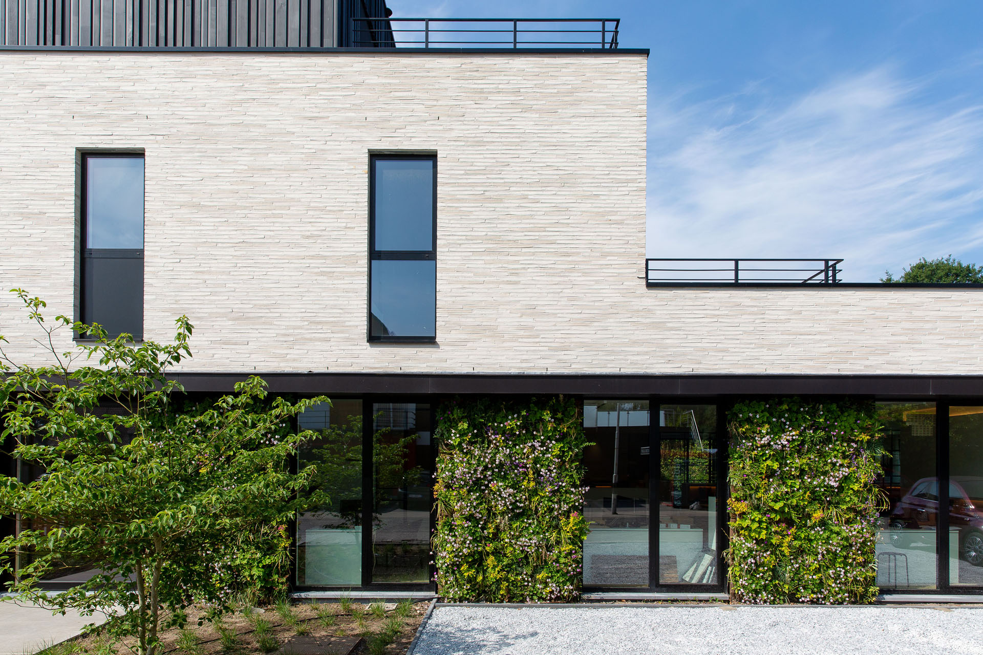 The architecture finds balance in the dialogue between horizontal stratification and vertical rhythm. Window openings create a living cadence across the façade, while the real estate office on the ground floor distinguishes itself with green façades on blind walls. This vertical vegetation is more than an aesthetic gesture: it embodies a biophilic approach that translates the company’s sustainable and environmentally conscious vision into its architectural presence.