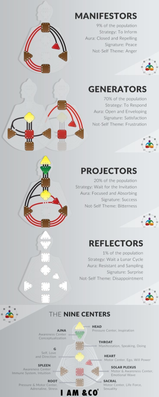 1. Generators (about 37% of the population): The life force of the world. Generators are like human batteries, powered by passion. When they do what they love, their energy is contagious, lighting up everyone around them.